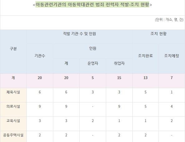 적발유형별로는 아동학대 관련 범죄 전력자가 아동 관련 기관의 △운영자인 경우가 5명 △취업자인 경우는 15명이었다.