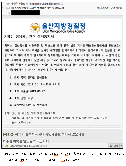 경찰청 사이버범죄수사과(테러수사1대)는 2019년 2월 12일 경찰기관을 사칭하여 출석요구서를 가장한 랜섬웨어가 첨부된 악성 이메일이 유포 중인 사건을 인지하고 수사에 착수함과 동시에 관계기관(한국인터넷진흥원)과 함께 포털사 수신차단 조치와 피해 주의를 긴급히 당부하였다.