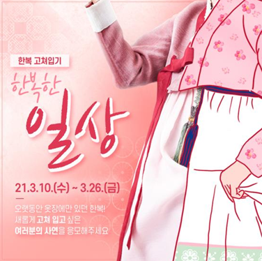 3. 10.~26. ‘한복한 일상 - 한복 고쳐 입기’, 입지 않는 한복과 사연 접수, 방탄소년단, 블랙핑크 무대의상 제작한 한복 디자이너 등 참여