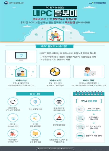 「내PC 돌보미 서비스」는 코로나19 지속으로 언택트 문화가 자리 잡으며 온라인 활동이 증가하면서 해킹 등 사이버 위협도 함께 증가하고 있어, 이에 대응하기 위하여 지난해 9월부터 시작하여 현재까지(2021.2월) 총 27,093건의 보안점검을 수행하고 있다.