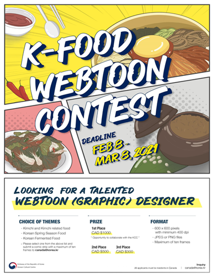 주캐나다한국문화원은 한식을 주제로 하는 한식 웹툰 공모전(2. 8.~3. 8.)과 함께 알곤퀸 대학 요리학과 학생을 대상으로 김치와 한식을 주제로 온라인수업을 진행(2. 17.)했다. 5월에는 캐나다 오타와에 있는 르꼬르동블루 요리학교 학생을 대상으로 온라인 한식강좌를 진행할 예정이다.