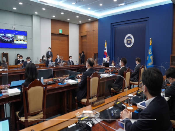 [투데이원=박성민 기자] 문재인 대통령은 청와대 여민1관에서 서울·세종청사 국무회의실과 영상회의로 열린 국무회의를 주재했다. 오늘 국무회의는 '제주4·3사건 진상규명 및 희생자 명예회복에 관한 특별법 전부개정법률 공포안' 등 법률공포안, '초·중등교육법 시행령 일부개정령안' 등 대통령령안, '2020년 자치분권 시행계획 이행상황 평가결과' 등 일반안건을 심의·의결했다.