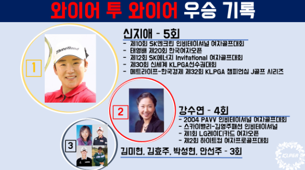 개인 우승 커리어에서 가장 많은 와이어 투 와이어 우승을 쌓은 선수는 다름 아닌 ‘골프 지존’ 신지애(33,스리본드)다. 화려한 별명처럼 신지애는 총 5번의 와이어 투 와이어 우승을 기록하며, KLPGA투어 역사에 한 부분을 차지했다. 이어 강수연(45)이 4회를 기록해 2위 자리에 올라있다.