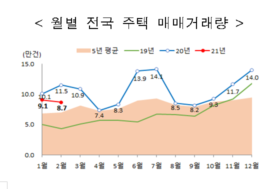 또한, 2021.2월까지 누계 주택 매매거래량은 177,700건으로 전년 동기(216,598건) 대비 18.0% 감소, 5년 평균(138,803건) 대비 28.0% 증가했다.