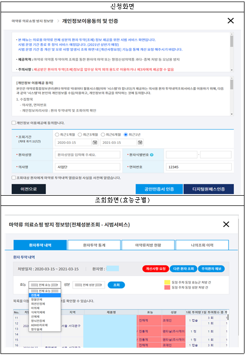식약처는 의사가 마약류 처방 시 환자가 같은 주차에 이미 동일 성분 또는 동일 효능군의 마약류를 처방 받은 이력이 있는지 ‘마약류 의료쇼핑 방지 정보망’을 토대로 알려주는 ‘중복 알림 서비스’도 제공한다.
