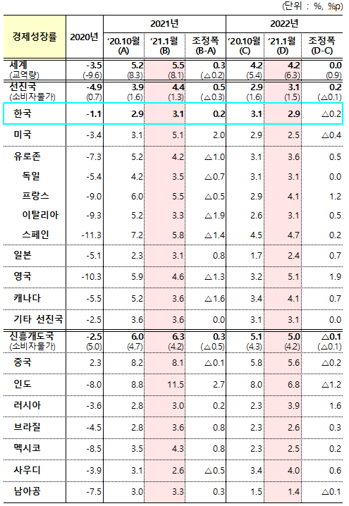 2021년 GDP 실적은 기존 전망(1월) 대비 0.5%p 상향 조정한 3.6%으로 전망했다.