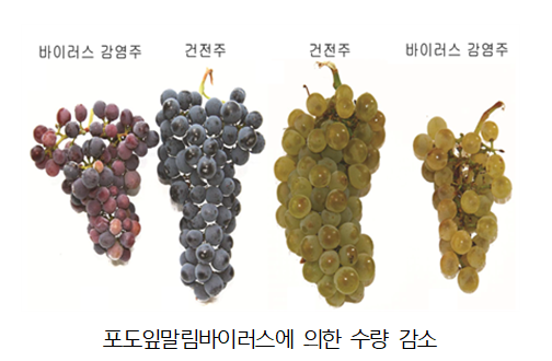 국내에서도 농촌진흥청 연구 결과, 바이러스에 감염된 사과나무와 포도나무는 생장과 과실 품질이 떨어졌고 수량이 줄어든 것으로 나타났다. 특히 3종의 바이러스와 바이로이드에 복합 감염된 포도 ‘캠벨얼리’ 품종은 바이러스에 감염되지 않은 무병묘보다 수량이 36% 감소했다.