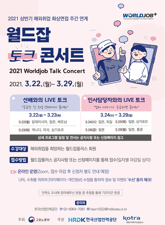 이번 ‘2021 월드잡 토크 콘서트’는 5월 개최되는 2021년 상반기 화상면접 주간(舊 글로벌일자리대전)과 연계한 사전행사로 취업 선배들에게 직접 해외 취업의 비결을 얻는 ‘취업 선배와의 라이브 토크’와 기업 인사담당자에게 직접 일자리 정보를 얻는 ‘인사담당자와의 라이브 토크’로 구성되어 있다.