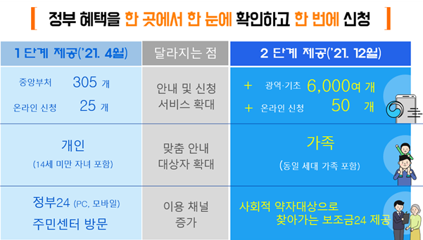 (안내 및 신청서비스 확대) 먼저, ‘보조금24’ 2단계 서비스가 시행되면 현재 1단계인 중앙부처의 3백여 개 서비스뿐 아니라, 자신이 거주하는 지자체에서 제공하고 있는 다양한 서비스(광역‧기초 기준 : 6천여 개) 중 본인에게 적용되는 서비스를 한 번에 안내받을 수 있다.