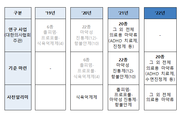 ‘사전알리미’는 마약류통합관리시스템으로 수집된 처방정보를 분석하여 오남용이 의심되는 처방 사례를 의사에게 서면으로 알리는 제도로, ‘식욕억제제’에 대해 최초로 도입(2020.12)한 이후 프로포폴(2021.2)과 졸피뎀(2021.3)에 대해서도 확대 시행했다.