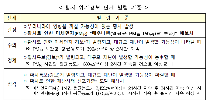 황사 위기경보 ‘관심’ 단계가 발령됨에 따라 환경부는 금일부터 상황반을 구성하여 관계 기관과 해당 지자체에 상황을 전파하고, ‘황사 대응 매뉴얼’에 따라 대응할 것을 요청했다.