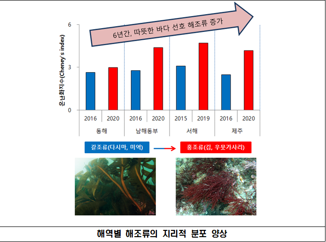 먼저, 온대성 해조류(갈조류)에 비해 상대적으로 따뜻한 바다에서 서식하는 열대·온대 혼합성 해조류(홍조류)는 남해 서부를 제외한 우리나라 전 해역에서 출현 종수와 분포가 확대되고 있었다. 또한, 따뜻한 대마난류에 직접적인 영향을 받는 해역에 출현하는 어류(총 112종) 중 난류종 어종수가 최근 6년간 약 18%(2015년 52%→2020년 70%) 증가하였다.