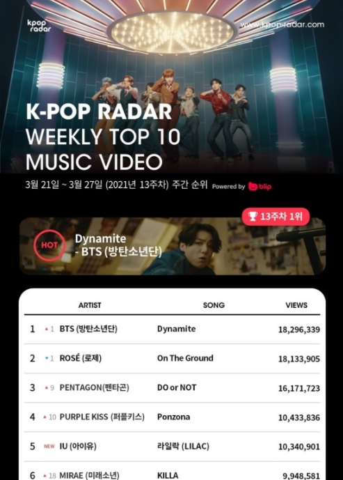 방탄소년단의 ‘Dynamite(다이너마이트)’ 뮤직비디오는 케이팝 레이더 13주차 집계 기간 (3월 21일 ~ 3월 27일) 동안 1,829만 뷰를 기록하며, 약 3주만에 다시 1위의 자리를 되찾았다.