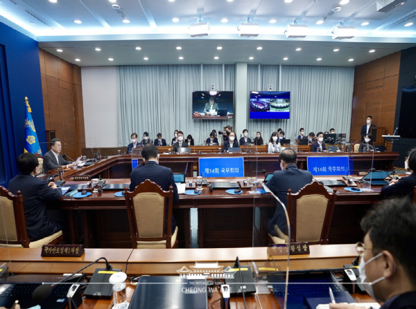 국무회의에서는 '국가경찰과 자치경찰의 조직 및 운영에 관한 법률 일부개정법률 공포안' 등 법률공포안, '삼차원프린팅산업 진흥법 일부개정법률안' 등 법률안, '이자제한법 제2조 제1항의 최고이자율에 관한 규정 일부개정령안' 등 대통령령안, '2022년도 예산안 편성지침' 등 일반안건을 심의·의결했다.