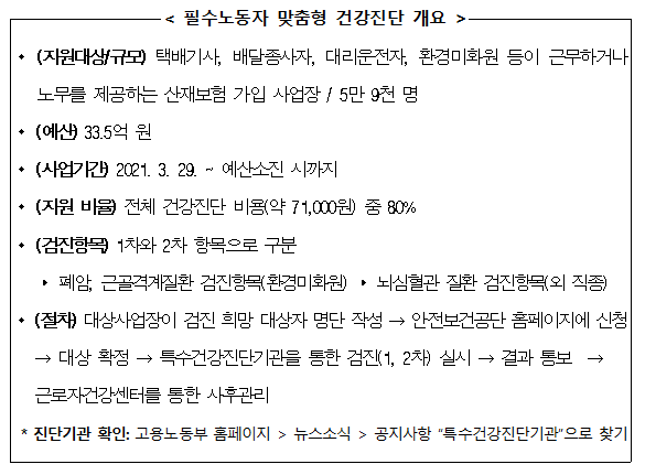 택배기사, 배달종사자, 대리운전기사는 장시간 근로, 야간작업으로 인한 과로사 위험에 따른 뇌심혈관계 중심의 검사가 실시되며, 환경미화원의 경우에는 차량 매연 등 디젤엔진 배출가스로 인한 폐암 발생과 관련한 호흡기계 검사와 무거운 생활폐기물 취급에 따른 근골격계질환 검사가 실시된다.