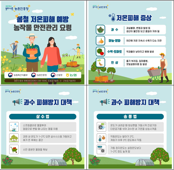 따라서 방상팬, 미세살수장치 등 저온 피해 예방시설을 마련한 농가는 개화기 저온에 대비해 각 장치의 작동 여부를 점검하고, 연소법을 활용할 농가는 연소자재를 미리 준비하여 기온이 떨어졌을 때 적극 대응해야 한다.