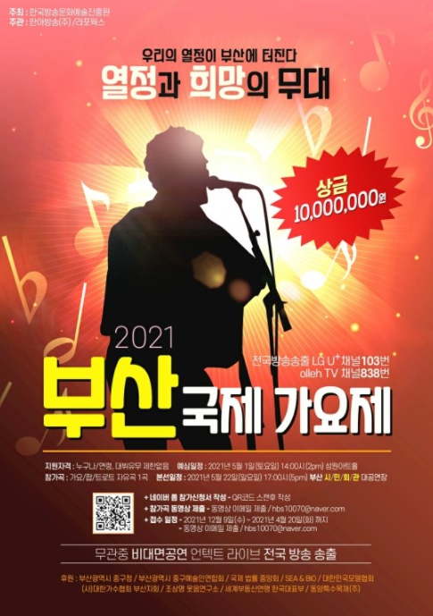 부산국제가요제는 언텍트 무관중 전국방송 라이브 송출로 비대면 가요제를 참가 또는 관람 할 수 있다.