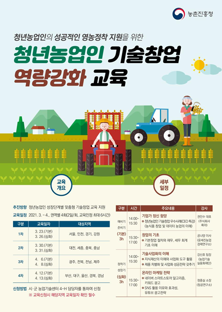 사전 신청자 외에도 교육 참여를 희망하는 청년농업인은 관할 농업기술센터 4-H(사에이치) 및 농업인교육 담당자를 통해 신청할 수 있다.