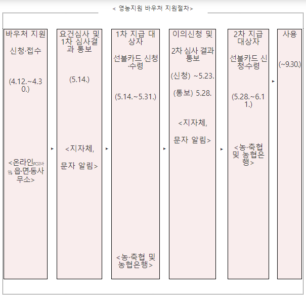 온라인 신청은 4.12일~4.30일까지 바우처 누리집(농가지원바우처.kr)에서 가능하며, 현장 신청은 4.14일~4.30일까지 해당 품목을 재배하는 농지 소재지의 읍·면·동사무소에서 할 수 있다.