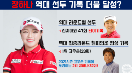 2021시즌 ‘역대 라운드별 선두’ 그리고 ‘역대 최종라운드 챔피언조 편성 기록’을 통해 KLPGA 역사를 새롭게 작성할 장하나의 행보에 귀추가 주목된다.