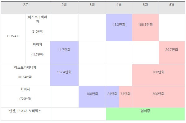 상반기에 도입이 확정되어 있는 백신은 총 1,808.8만 회분으로, 이 중 지난 주말에 도착한 코백스 아스트라제네카 백신 43.2만 회분과 화이자 백신 25만 회분을 포함하여, 총 337.3만 회분이 현재까지 도입 완료되었다.