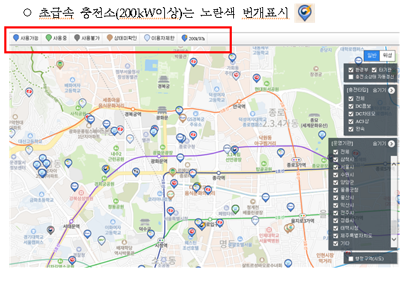 또한, 충전속도가 높은 충전기를 쉽게 구별할 수 있도록 200kW 급속충전기와 향후 구축되는 초급속 충전기는 별도 표기를 추가한다.