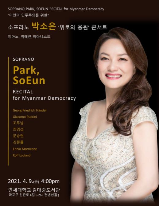 그동안 자선과 기부를 겸한 음악회를 개최해온 소프라노 박소은 장신대 외래교수와 (사)국민독서문화진흥회 종로구-동대문구 지부, 유통회사 ㈜링크이, 백룡컴퍼니, 소프라노 박소은 교수 팬클럽은 4월9일(금) 오후4시 서울 마포구 동교동 연세대학교 김대중도서관 컨벤션홀에서 조모아 한국미얀마연대 대표 등 20여명의 미얀마 시민들과 함께 ‘미얀마의 민주주의와 자유를 위한 위로와 응원 콘서트’를 공동 개최합니다.