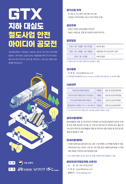 국토교통부가 주최하고 국가철도공단, 한국철도학회, 에스지레일(주)가 주관하는 이번 공모전에는 대한민국 국민이라면 누구나 참여 가능하며, 한국철도학회 누리집에서 공모전 양식을 다운로드 후 작성하고 4월 12일부터 5월 7일까지 이메일로 접수하면 된다.