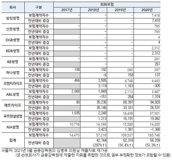 외화보험은 원화보험과 상품구조는 같지만, 보험료 납부와 보험금 지급 그리고 해약환급금까지 모두 외국통화로 이뤄지는 보험상품이다. 외화보험 가입자수가 최근 3년동안 해마다 평균 146%씩 증가(2017년→2018년 297%↑,2018년→2019년 91.4%↑, 2019년→2020년 51.3%↑)하는 가운데, 지난해부터 신규 외화보험 상품 설계와 판매를 시작하는 손해보험·생명보험사도 늘고있는 추세다. 특히 외화보험이 ‘글로벌 기축통화인 달러에 자산을 배분해 위험을 분산하며, 10년 이상 유지하면 이자수익에 대한 비과세 혜택을 받을 수 있다’고 알려지며 가입자 수가 증가하고 있다.