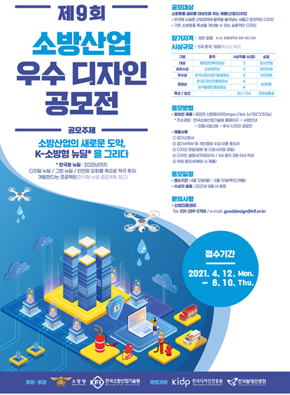 주제는‘소방산업의 새로운 도약, K-소방형 뉴딜을 그리다’로 소방용품, 설비를 대상으로 창의적이고 실용적인 디자인을 공모한다.