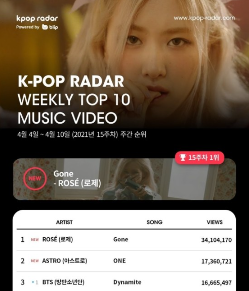 로제의 첫 싱글 앨범 ‘R’에 수록된 ‘Gone(곤)’ 뮤직비디오는 케이팝 레이더 15주차 집계 기간 (4월 4일 ~ 4월 10일) 동안 3,410만 뷰를 기록하며 1위의 자리에 올랐다.