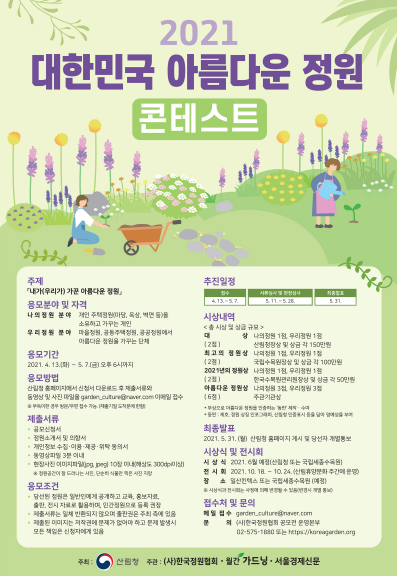 이번 공모전은 '내가(우리가) 가꾼 아름다운 정원'이란 주제로, 산림청이 주최하고 (사)한국정원협회ᆞ월간가드닝ᆞ서울경제신문이 공동주관한다.