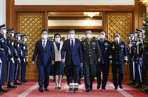 문 대통령은 삼정검에 수치를 매어 주고 배우자에게 꽃다발을 수여하며 신임 진급을 축하했다.