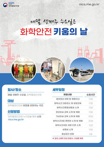 이번 체험교육 과정은 4월 14일부터 매월 셋째 주 수요일에 열리며, 화학안전 정보를 알기 힘든 어린이, 학생, 지역 주민, 외국인 근로자 등을 비롯해 화학사고 비상대응기관 종사자를 대상으로 진행한다.