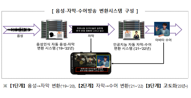 과기정통부와 방통위는 ‘19년부터 음성-자막-수어 자동변환 시스템을 개발 및 연계하여, 감성표현이 가능한 아바타 수어 서비스의 방송활용을 목표로 하고 있다.