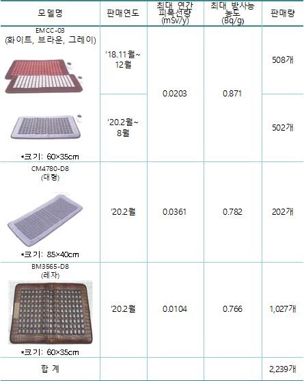 제품에 포함된 방사능 물질 분석결과, 3종 모두 연간 방사선피폭선량이 0.0104∼0.0361mSv/y에 해당 되어 생활방사선법상 가공제품에 적용되는 안전기준(1mSv/y)을 초과하지 않는 것으로 확인되었다.
