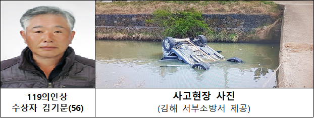 김씨는 3월 21일 낮 12시경, 김해시 화목동에서 낚시를 하고 있던 중 SUV차량이 농수로로 추락한 것을 목격하였고 이에 지체없이 물에 뛰어들었다.