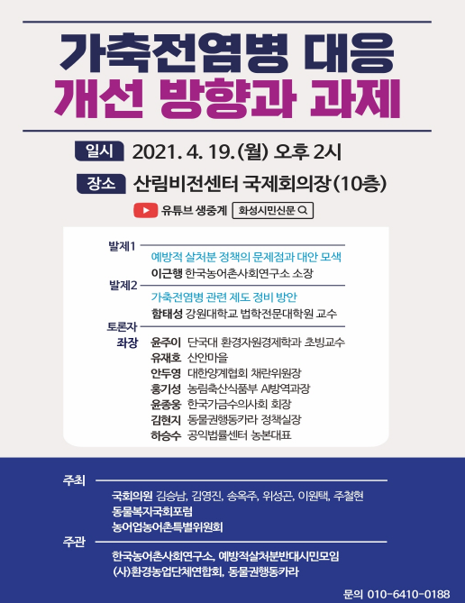 이번 토론회는 고병원성 조류인플루엔자(avian influenza, 이하 AI)에 대한 정부의 가축방역 문제점 분석과 바람직한 대안을 찾기 위해 마련되었으며, 국회 농림축산식품해양수산위원회 김승남 의원, 김영진 의원, 위성곤 의원, 이원택 의원, 주철현 의원·대통령직속 농어업농어촌특별위원회·동물복지국회포럼이 공동 주최하고, 한국농어촌사회연구소·예방적살처분반대시민모임·(사)환경농업단체연합회·동물권행동카라가 공동 주관한다.