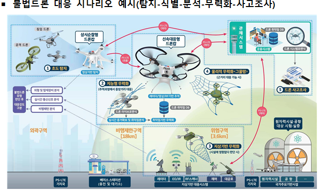 또한, 재난안전통신망(PS-LTE)을 통해 연결된 지상기반/공중기반 시스템을 중요시설에 최적으로 배치하고, 지능형 무력화 원천기술과 포렌식 기술을 적용하기 위한 통합 운용시스템을 구축․실증할 계획이다.