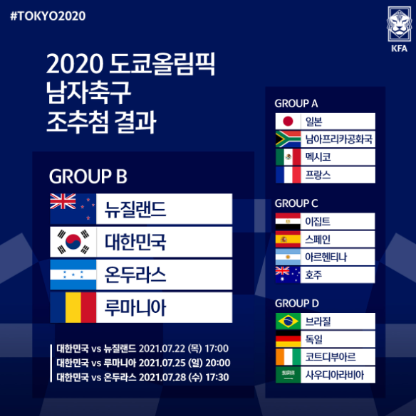 같은 조에 동일 대륙 참가팀이 2개국 이상 편성되는 건 불가하다는 원칙에 따라 조추첨이 진행됐고, 상대적으로 무난한 대진을 받아들게 됐다. 2012년 이후 9년 만에 올림픽 메달을 노리는 김학범호의 발걸음이 가벼워졌다. 남자 올림픽대표팀은 뉴질랜드와의 역대전적에서 3전 3승으로 절대 우위를 차지하고 있다. 온두라스와는 4번 맞붙어 2승 1무 1패를 기록했다. 올림픽대표팀과 루마니아와의 맞대결은 이번이 처음이다.