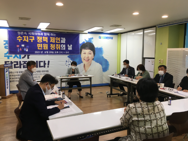 주민들의 민원과 정책제안을 청취하기 위해 정춘숙 의원을 비롯하여 유영호 경기도의원(여성가족평생교육위·예결위), 김은주 경기도의원(교육기획위)과 윤원균 용인시의원(자치행정위원장), 장정순 용인시의원(문화복지위원장) 그리고 수지구청 건설도로과 박성준 과장이 참석, 주민들과 함께 해결방안을 모색했다.