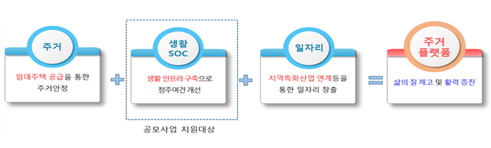 주거플랫폼 사업은 양질의 공공임대주택, 지역특화사업과 연계한 일자리, 생활인프라를 결합(주거+일자리+생활SOC)하여 살기 좋은 공간을 조성하는 사업이다.