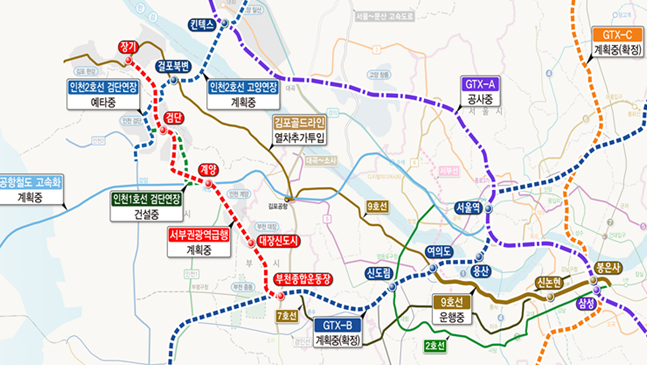 먼저 서부권광역급행철도는 김포 장기역∼부천종합운동장역 구간 (21.1km)의 신설을 추진할 예정이다.