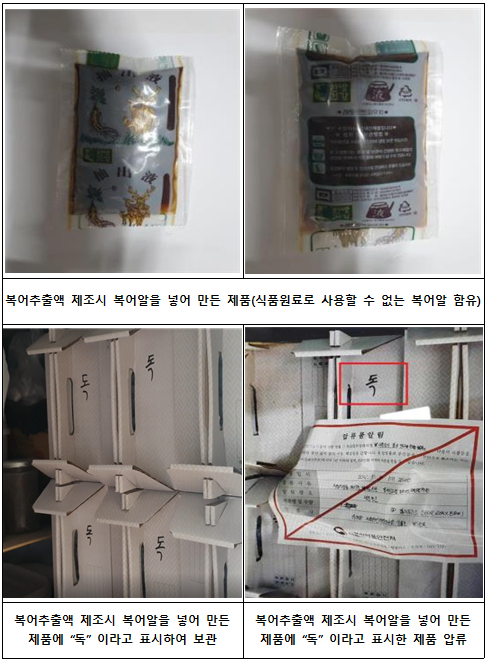 식약처는 식품에 사용할 수 없는 복어알, 피마자 등의 원료로 식품을 불법으로 제조하거나 소분해 판매한다는 정보를 입수하고, 지난 5월 중순부터 6월 중순까지 복어환·복어추출액 등을 제조하는 업체 등을 대상으로 단속을 실시했다.