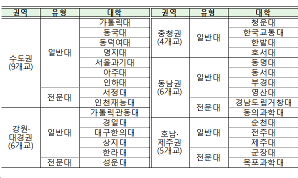 평가 결과에 따라 사업 참여가 결정된 대학 명단은 다음과 같으며, 각 대학에게 평균 7.8억 원의 사업비를 지원한다.