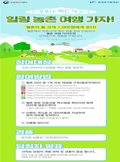 코로나19 예방접종을 하고 농촌체험휴양마을 등 농촌여행지를 방문한 사람을 대상으로 7월 1일부터 선착순 1,000명에게 1인당 1만원 상당의 기프티콘을 지급할 계획이다.