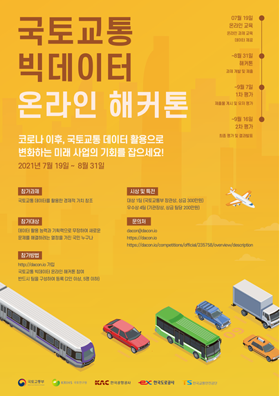 이번 해커톤은 국토연구원, 한국도로공사, 한국교통안전공단, 한국공항공사가 공동으로 주관하며, 참가팀에 대해 온라인 교육(유튜브), 참여작 평가 및 애로사항(미개방 데이터* 일부제공 등) 해결 등을 지원할 계획이다.