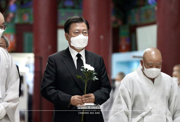 이후 문 대통령은 대한불교조계종 총무원장이자 월주 대종사의 상좌인 원행 스님과 환담을 나누었다.