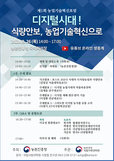 식량의 안정적 공급을 위한 첨단 융·복합 디지털 농업기술 소개와 미래 농업환경 변화에 대응한 발전 전략에 대한 전문가 발표와 종합토론이 있을 예정이다. 코로나19 확산 방지 차원에서 외부 참석자 없이 최소한의 관계자만 참석한 가운데 진행된다.