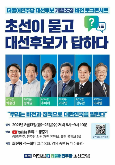 한편 토크콘서트는 민주당의 공식 유튜브 채널인 델리민주와 함께 민주당 초선의원의 개인 유튜브 방송으로 동시 송출될 예정이며 후보별로 선정한 파워유튜버도 생중계할 예정이다.